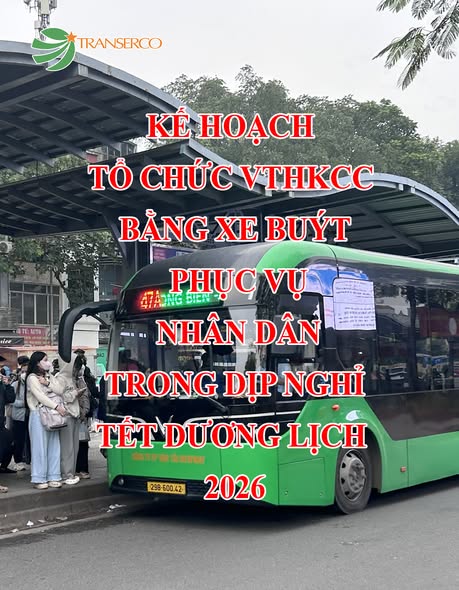 KẾ HOẠCH TỔ CHỨC VTHKCC BẰNG XE BUÝT PHỤC VỤ NHÂN DÂN TRONG DỊP NGHỈ TẾT DƯƠNG LỊCH 2026 ------------------------------------------- 🚍 Nhằm đáp ứng tốt nhất nhu cầu đi lại của nhân dân và du khách đến Thủ đô tham quan, thăm thân trong các ngày trước, trong và sau kỳ nghỉ Tết Dương lịch năm 2026, Tổng công ty Vận tải Hà Nội (Transerco) triển khai kế hoạch tổ chức vận tải hành khách công cộng bằng xe buýt với tinh thần văn minh, lịch sự, an toàn và chu đáo. ℹ️ Về biểu đồ chạy xe: Các tuyến xe buýt hoạt động theo biểu đồ chạy xe hiện hành, bảo đảm duy trì ổn định mạng lưới và chất lượng dịch vụ. 🚎 Bên cạnh đó, Transerco dự kiến bố trí dự phòng 25 xe buýt (tương ứng khoảng 48 lượt xe) để sẵn sàng tăng cường, giải tỏa hành khách tại các bến xe, điểm trung chuyển và khu vực có nhu cầu đi lại tăng cao khi cần thiết. 💎 Để công tác phục vụ hành khách trong dịp nghỉ Lễ Tết Dương lịch được đảm bảo, Transerco yêu cầu các đơn vị trực thuộc: Chủ động tổ chức điều hành, phân công lịch trực, tăng cường lực lượng giải tỏa hành khách tại các vị trí được giao; Điều hành linh hoạt các tuyến xe buýt, bảo đảm ổn định luồng tuyến và các chỉ tiêu chất lượng dịch vụ; Trang hoàng trụ sở, tăng cường công tác tuần tra, bảo vệ; Thực hiện nghiêm các biện pháp phòng, chống cháy nổ trên tuyến và tại đơn vị; Đảm bảo an ninh chính trị, trật tự an toàn xã hội và an toàn giao thông, duy trì hoạt động sản xuất, cung ứng dịch vụ phục vụ nhân dân trong dịp Lễ. 💫 Transerco trân trọng thông tin tới quý khách hàng và người dân để thuận tiện trong việc lựa chọn, sử dụng dịch vụ xe buýt trong kỳ nghỉ Tết Dương lịch sắp tới. 🌾 Kính chúc quý khách hàng và người dân một kỳ nghỉ Tết Dương lịch và chào đón năm mới 2026 an toàn, mạnh khỏe và tràn đầy niềm vui. 🌟 ------------------------------------------- TRANSERCO - CHUNG BƯỚC THÀNH CÔNG! ☎️ Hotline: 1900.1296 🌏 Website: https://transerco.com.vn/ 🚌 Tra cứu lộ trình tại ứng dụng: Timbuyt 📪 Kênh Zalo OA: “Xe buýt Hà Nội Transerco”