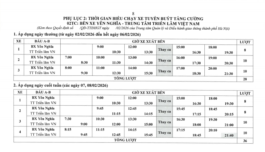 Thời gian thực hiện từ ngày 02/02/2026 đến hết ngày 08/02/2026 theo lộ trình và biểu đồ hoạt động như sau: