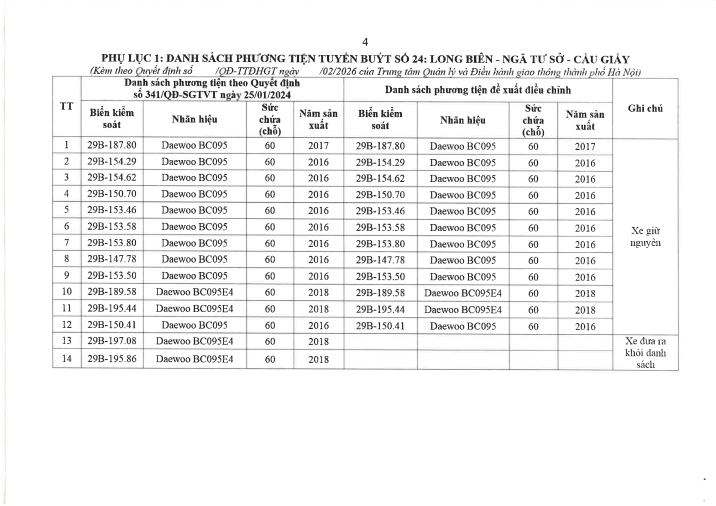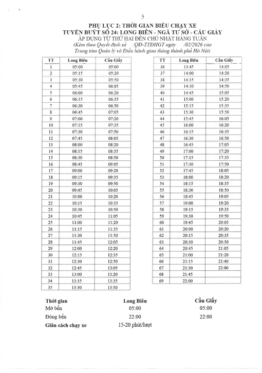 Từ ngày 01/3/2026: điều chỉnh tạm thời số xe kế hoạch, số xe vận doanh, lượt xe ngày, thời gian biểu chạy xe tuyến buýt số 24: Long Biên – Ngã Tư Sở – Cầu Giấy