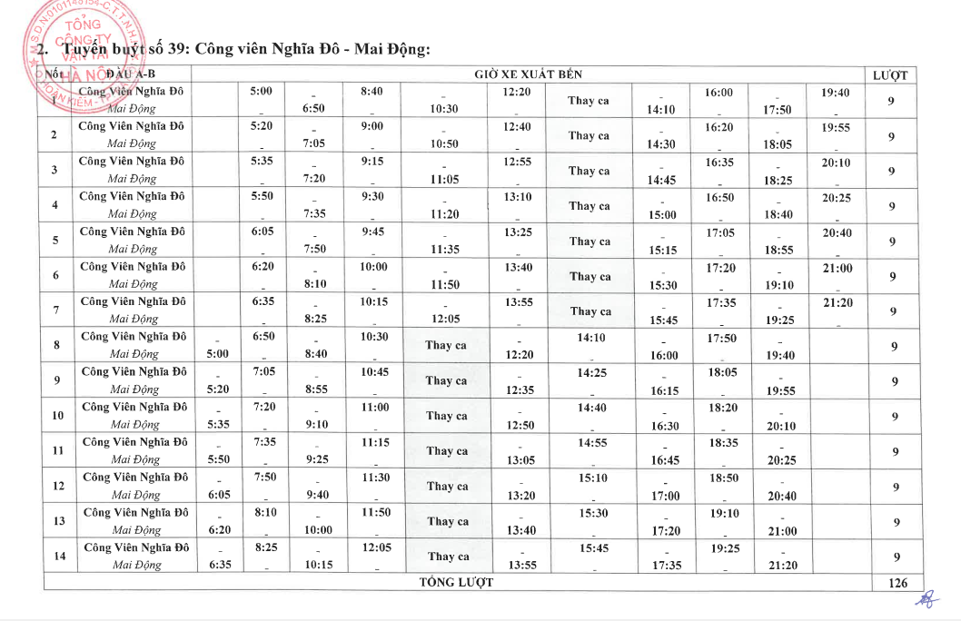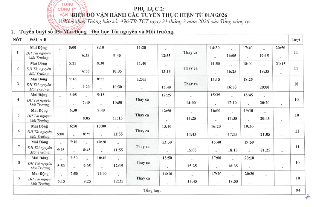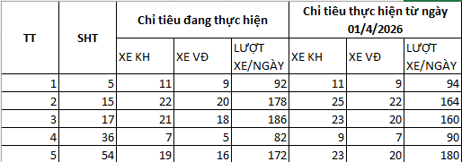 Chỉ tiêu dịch vụ trên 06 tuyến buýt của Tổng công ty từ ngày 01/4/2026 như sau: