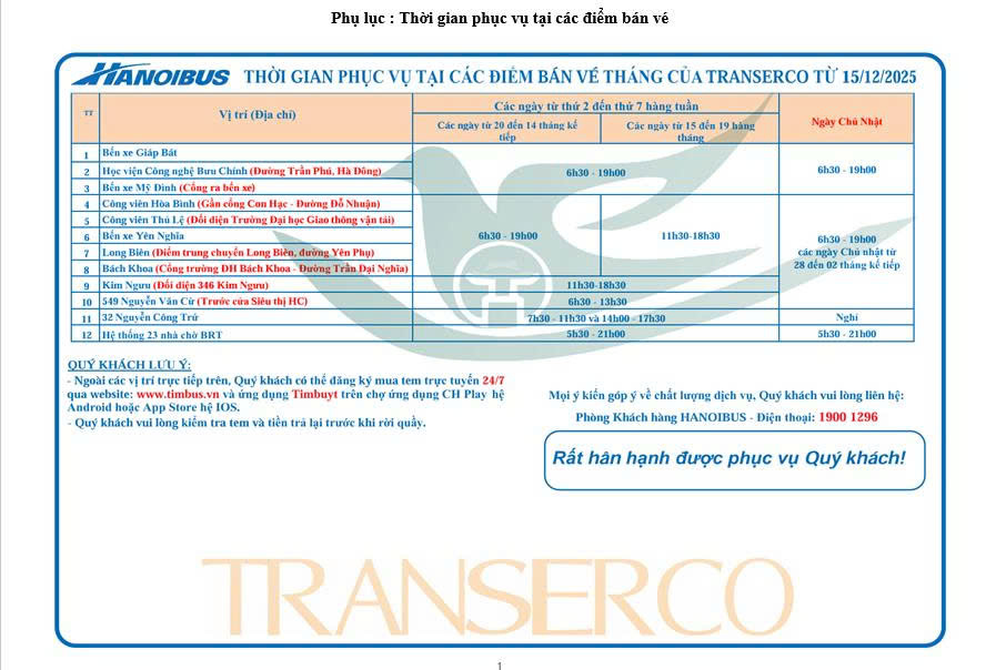 THÔNG BÁO THAY ĐỔI THỜI GIAN LÀM VIỆC TẠI CÁC ĐIỂM BÁN TEM VÉ THÁNG CỦA TRANSERCO.